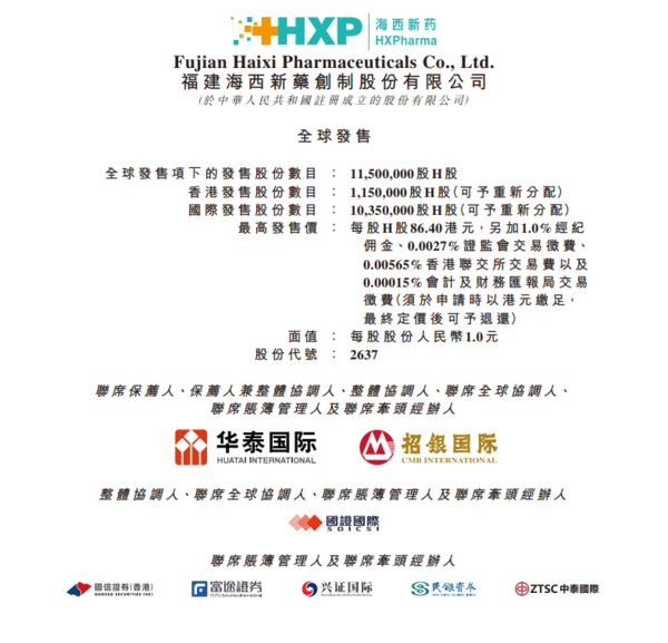 新股IPO|海西新藥2637招股、孖展96億超購94.6倍 集資最多近10億元、一手入場費約4364元